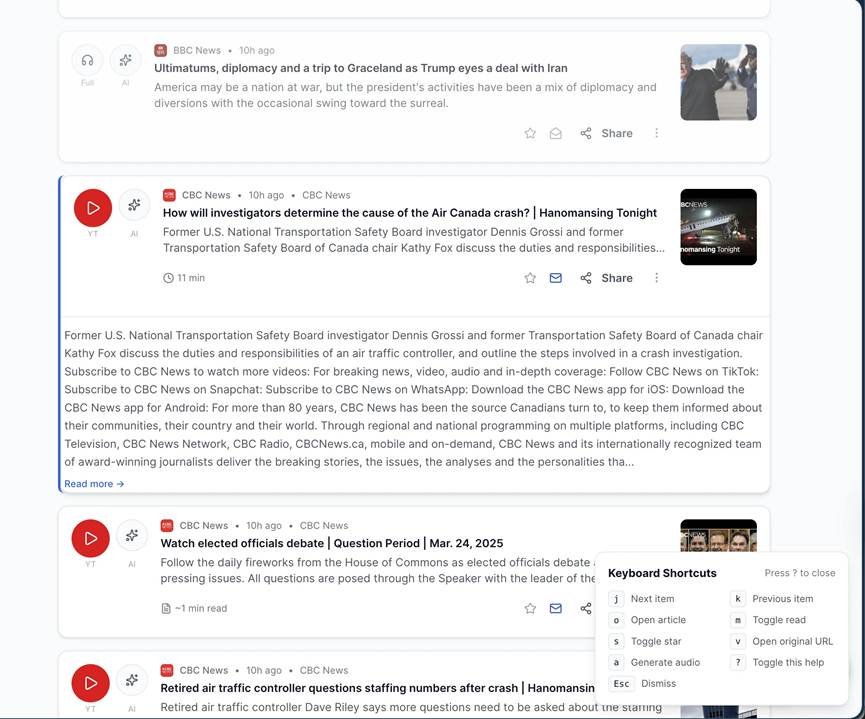 - Daily Brief — a personalized audio briefing each morning combining your feeds and trending stories