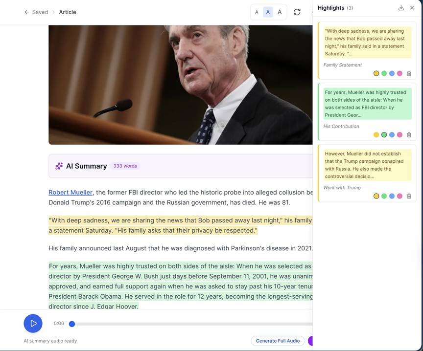 - AI summaries — long articles condensed into 3-5 minute audio digests