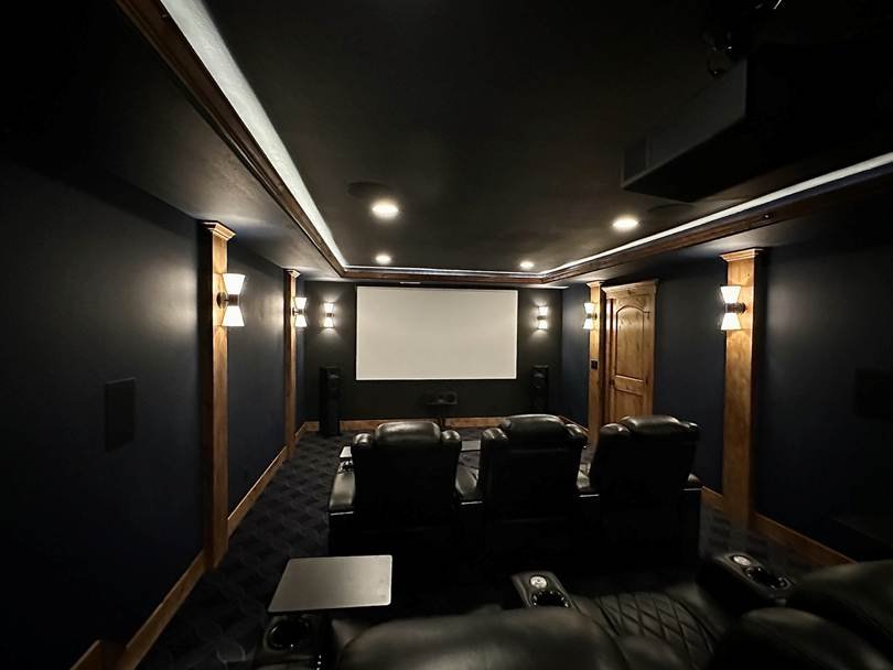 A custom home theater built by Alpine Contracting with dedicated seating, acoustics and projection.