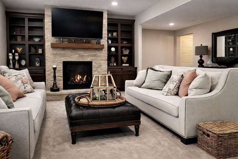 An Alpine Contracting basement renovation featuring custom built-ins and stone fireplace surround.