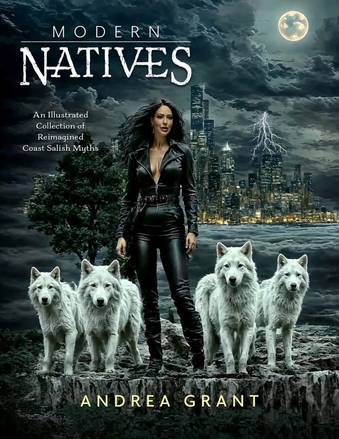 Andrea Grant is a Canadian-born writer and multimedia artist of mixed-blood Coast Salish ancestry whose work merges Indigenous mythology with contemporary art. Her latest book, MODERN NATIVES: AN ILLUSTRATED COLLECTION OF REIMAGINED COAST SALISH MYTHS (Eaglespeaker Publishing), reinterprets ancestral stories through a modern lens, imagining spirits walking through New York City and wolves under Manhattan streetlights.