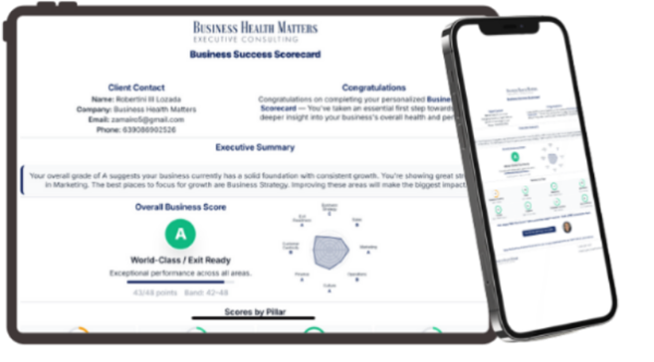 Using an algorithmic scoring model based on The Small Business BIG EXIT framework, the tool generates an immediate Business Health Score along with a personalized performance snapshot. Each participant also receives a free executive summary report highlighting strengths, vulnerabilities, and targeted areas for improvement.
