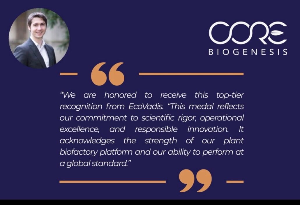 “We are honored to receive this top-tier recognition from Ecovadis,” said Thibault Mandicourt, Director of Operations at Core Biogenesis. “This medal reflects our commitment to scientific rigor, operational excellence, and responsible innovation. It acknowledges the strength of our plant biofactory platform and our ability to perform at a global standard.”