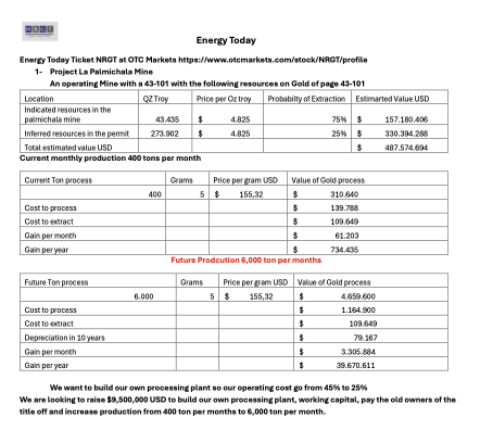 In April 2024, Energy Today started negotiations with the current owners of the title of La Pamichala to operate the Gold Ore Concentrate with high resources.