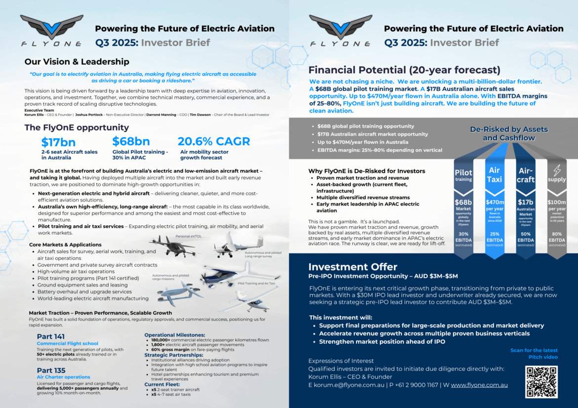 “This investment offer marks a pivotal moment for FlyOnE,” said Korum Ellis, CEO and Founder of FlyOnE. “We are evaluating it carefully to ensure it aligns with our long-term vision as we prepare for a public listing. Our goal remains clear — to electrify aviation in Australia and beyond, eliminating leaded fuels in aviation and making flying electric aircraft as accessible as booking a rideshare.”