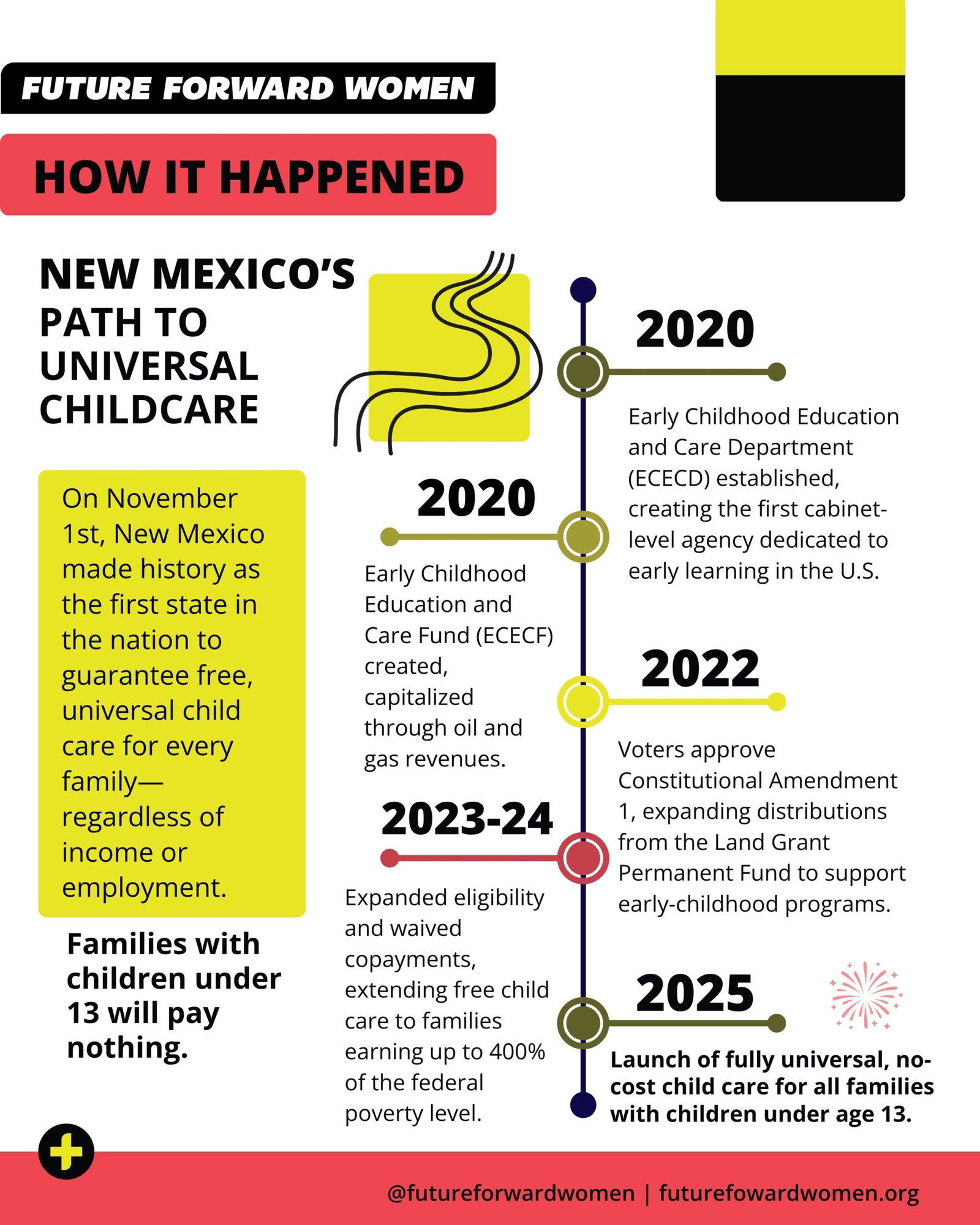 To help other states follow New Mexico’s lead, Future Forward Women will launch the State Leaders Learning Series in early 2026 as part of its Legislative Exchange and Innovation Lab. The series will equip governors, legislators, and state agencies with the tools, training, and cross-state collaboration needed to design and advance universal child care and other family-centered economic policies. Grounded in evidence-based policy design and practical governance, the initiative aims to help states translate bold ideas into effective, equitable solutions.