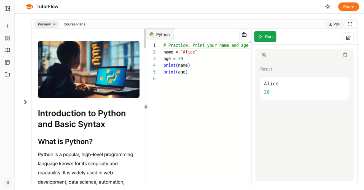 The TutorFlow Code Editor introduces AI pair programming, giving users real-time assistance with suggestions, explanations, and debugging support. Because it is integrated into TutorFlow, coding practice takes place directly within lessons and quizzes, creating a seamless transition between learning and application. Real-time execution allows learners to compile and run code instantly, test ideas without configuration, and gain feedback immediately.