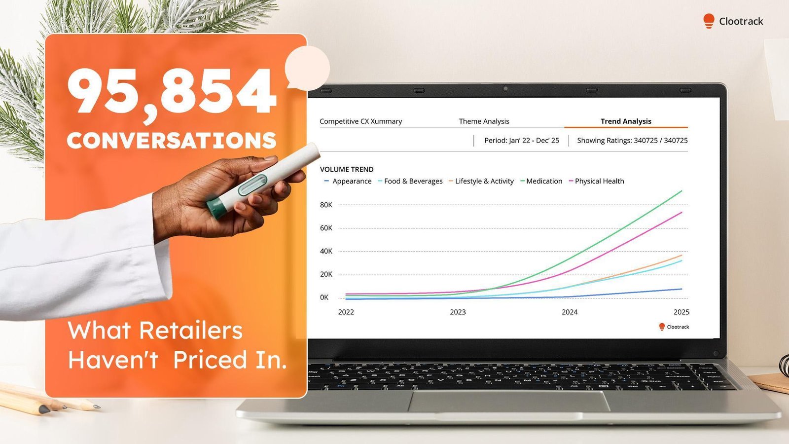Clootrack analyzed 95,854 consumer conversations to map how GLP-1 adoption is restructuring demand across grocery, apparel, beauty, and fitness before it shows up in transaction data.