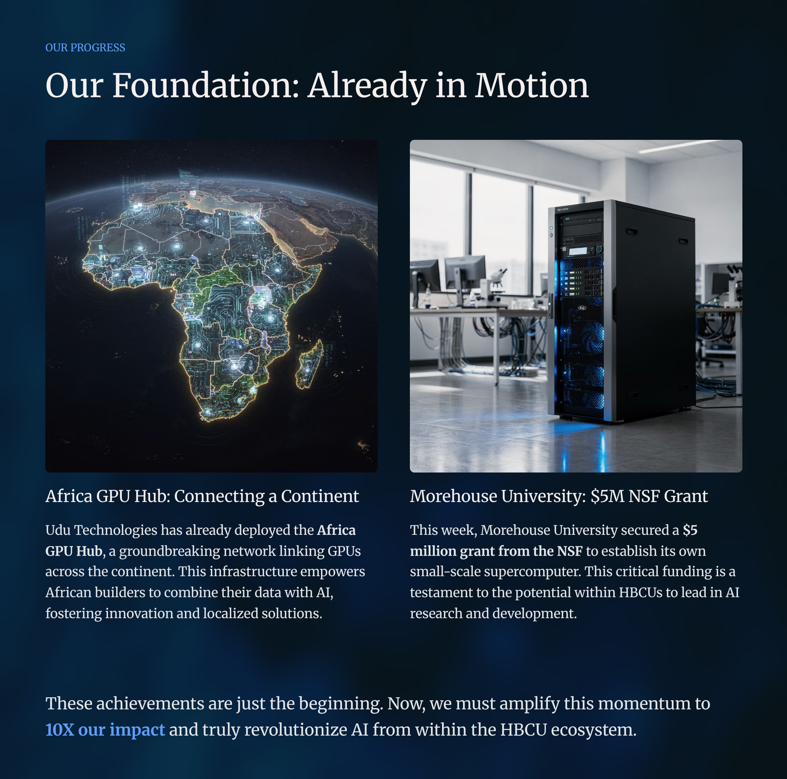 The briefing laid out a bold declaration: building the Starline Supercomputer, a sovereign AI network anchored at America’s Historically Black Colleges and Universities (HBCUs) and partner universities across the Caribbean and Africa.