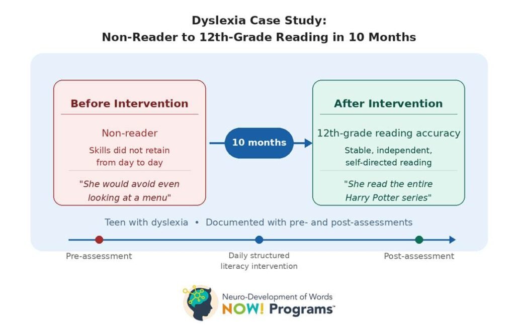 JACKSONVILLE, FL — Dr. Tim Conway, a PhD neuropsychology and fMRI researcher and founder of NOW! Programs®, has documented a clinical case study showing a 13-year-old homeschooled student progressing from non-reader to 12th-grade reading accuracy in under 10 months. The student completed daily structured literacy intervention through the NOW! Foundations for Speech, Language, Reading and Spelling® program. Pre- and post-intervention assessments demonstrated measurable gains in phonological processing and reading accuracy. These results align with experience-dependent neuroplasticity—the brain’s ability to build reading skills through structured, evidence-based training that did not require any different sequence of learning than occurs for typical readers.