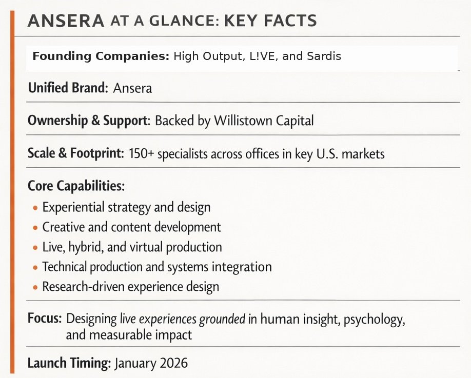 Founding Companies: High Output, L!VE, and Sardis Unified Brand: Ansera Ownership & Support: Backed by Willistown Capital   Scale & Footprint: 150+ specialists across offices in key U.S. markets   Core Capabilities:   Experiential strategy and designCreative and content developmentLive, hybrid, and virtual productionTechnical production and systems integrationResearch-driven experience design   Focus: Designing live experiences grounded in human insight, psychology, and measurable impact   Launch Timing: January 2026