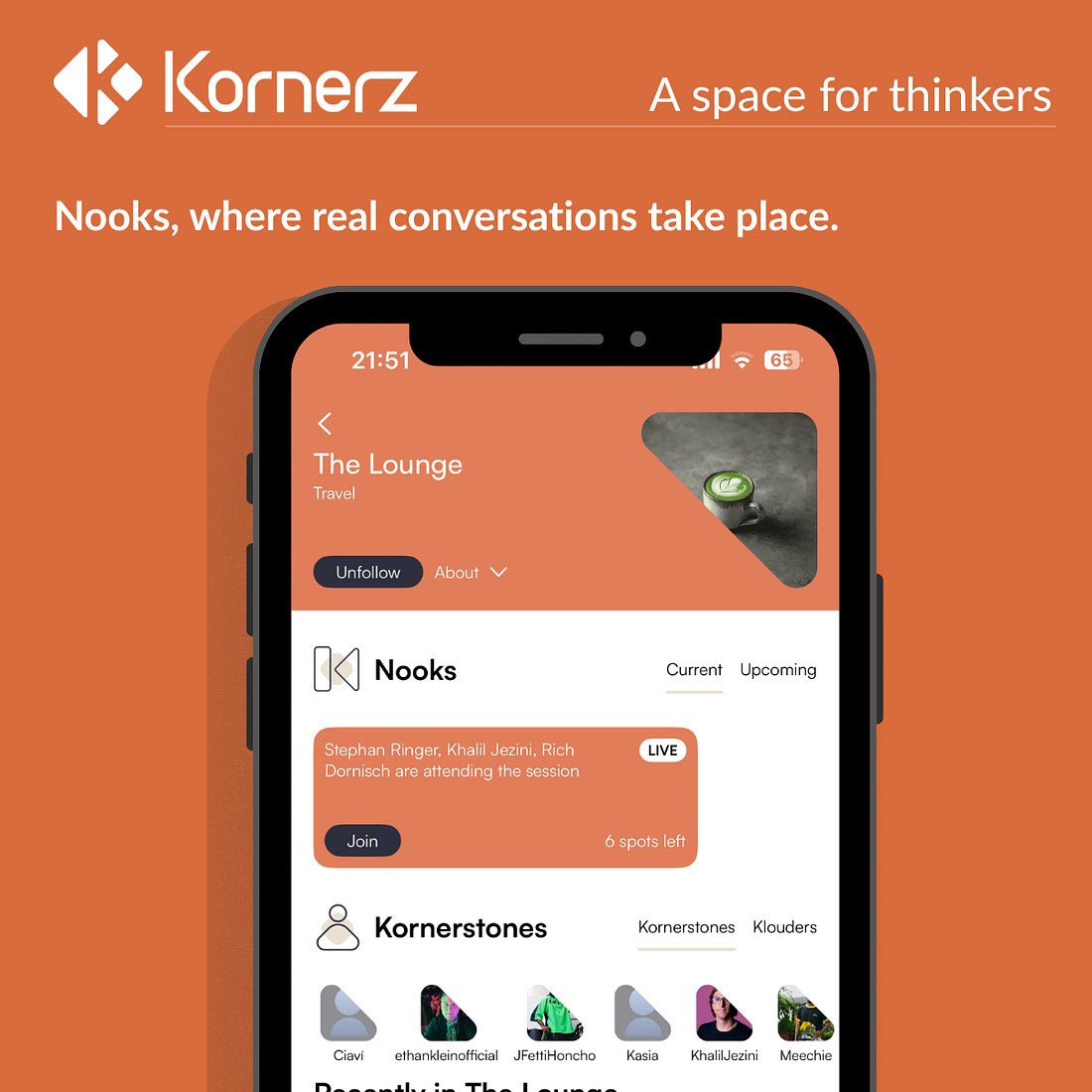 This new User Experience or UX is the clearest path yet to that promise. We’ve replaced the ‘feed’ with a curated ecosystem of Korners—each one a thematic community led by vetted Kornerstones. But the heart of the experience is the Nook: an opt-in, video chat room strictly limited to 9 people.