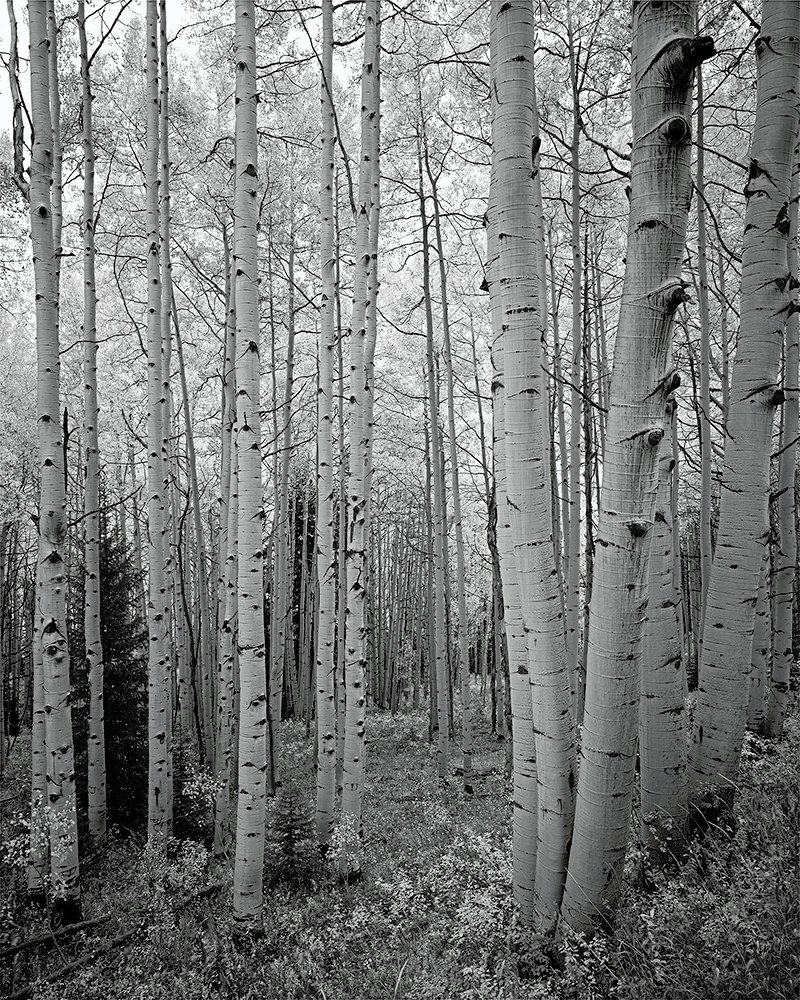 By removing the element of color, Schuman heightens the viewer’s awareness of line, shape, and spatial rhythm. The verticality of trunks, the sweep of branches, and the light-play between trees come forward in precise detail. His approach allows the Aspen Grove photographs to speak through silence—evoking a sense of reflection, stillness, and architectural grace.