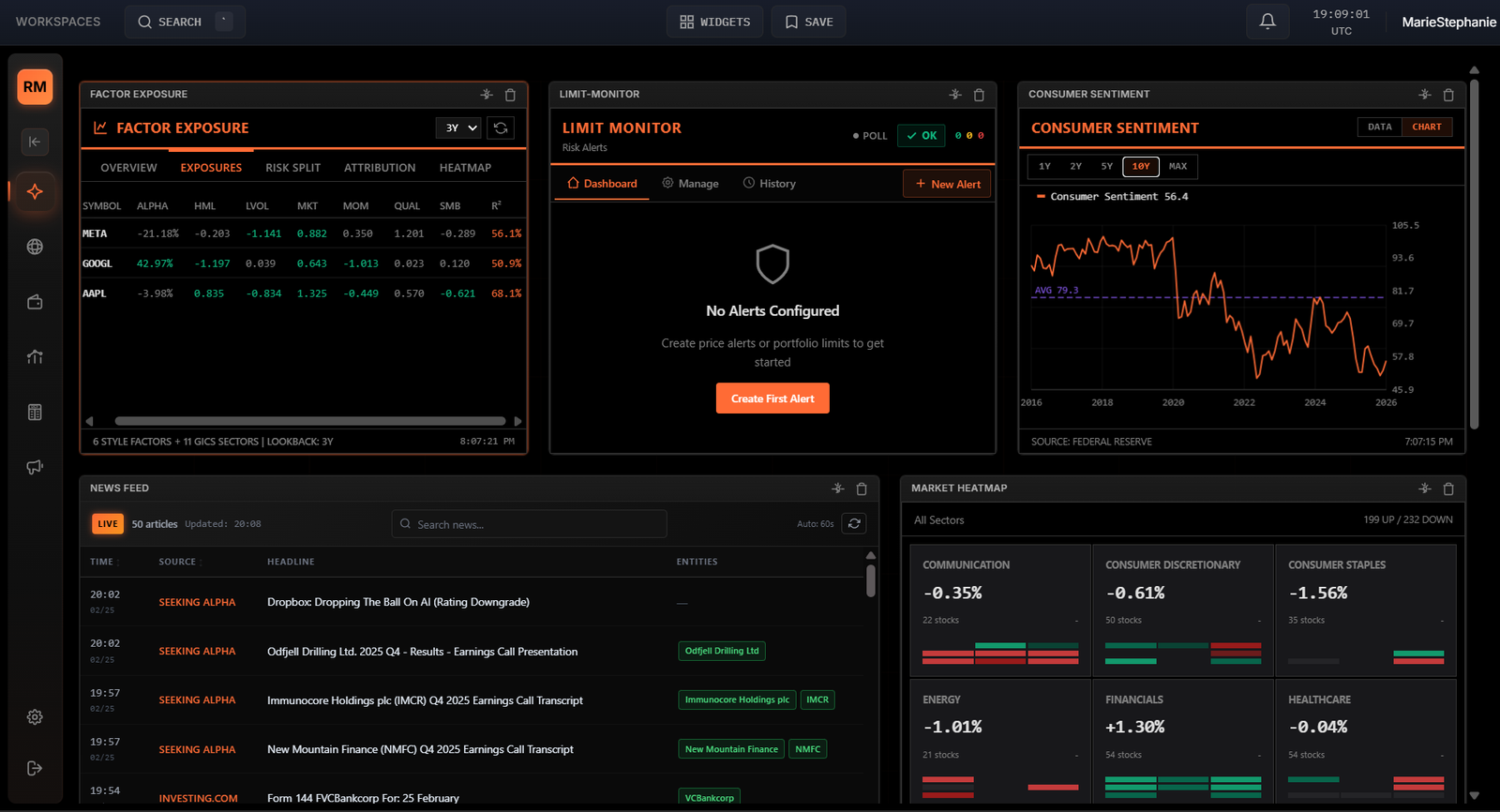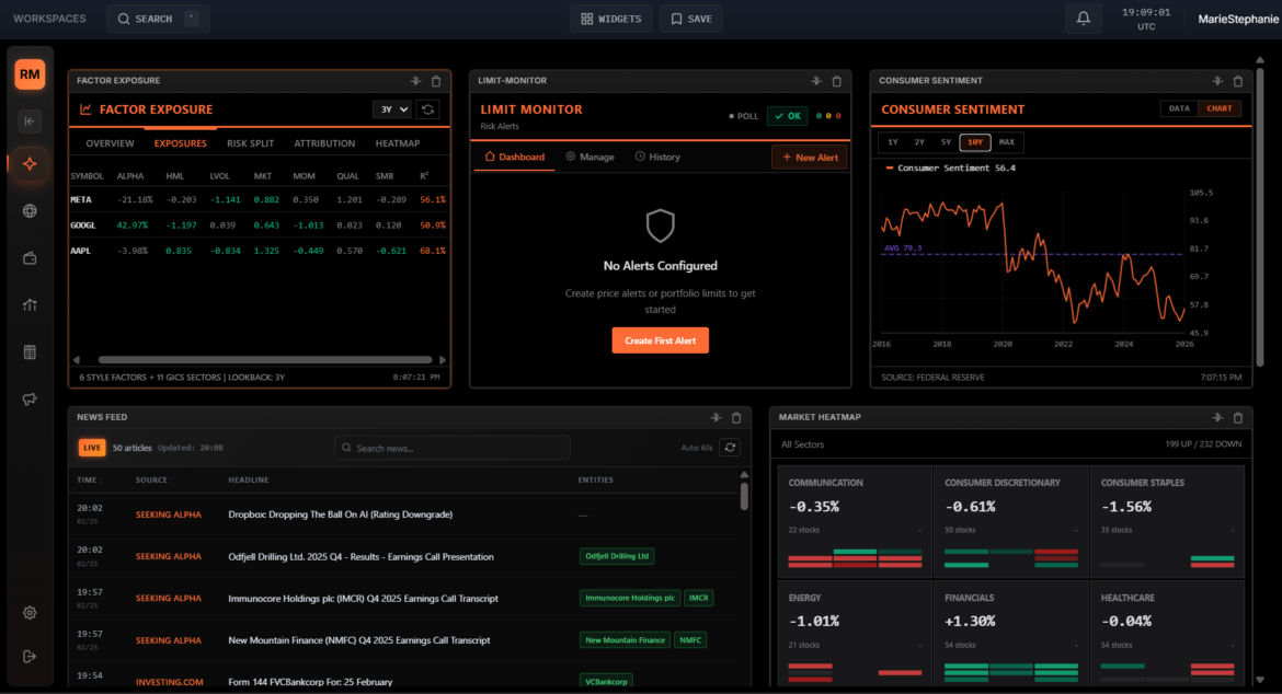 - Real-Time Limit Monitor: Moves beyond basic price alerts by allowing users to set dynamic triggers for Portfolio VaR thresholds, position concentration limits, and maximum drawdown breaches, delivered instantly via Server-Sent Events (SSE).