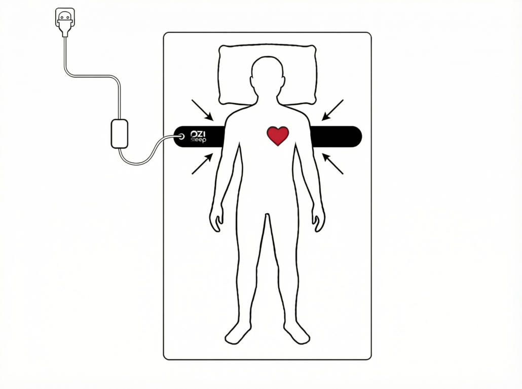 The OZI Sleep Tracker is a non-invasive system placed under a mattress that monitors a child’s sleep in real time—including heart rate, breathing patterns, and movement—without requiring any wearable device.