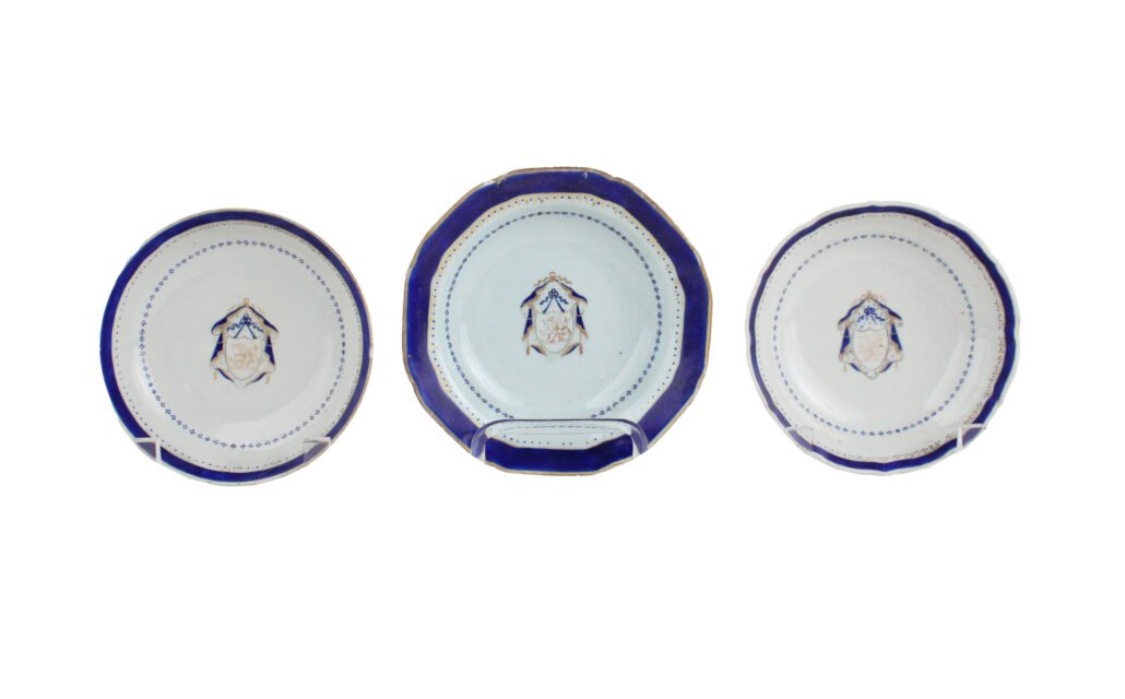 Chinese Export porcelain : The John Brown group of Chinese Export armorial table articles, 18th/19th century, with family monograms, “JB” for John Brown. Small plates, small bowls and fruit bowls. 30 pieces total. Estimate: $800-$1,200