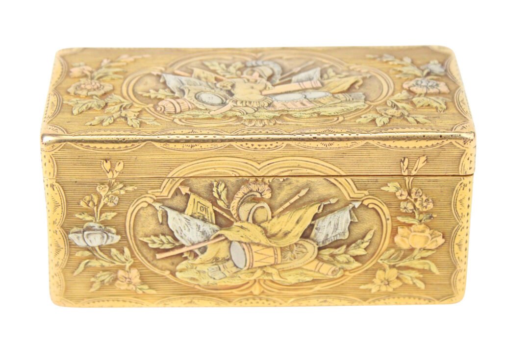 Gold box:J.M Tiron Seven Year War gold snuff box, French. 18th century, Jean-Marie Tiron. Estimate: $10,000-$15,000