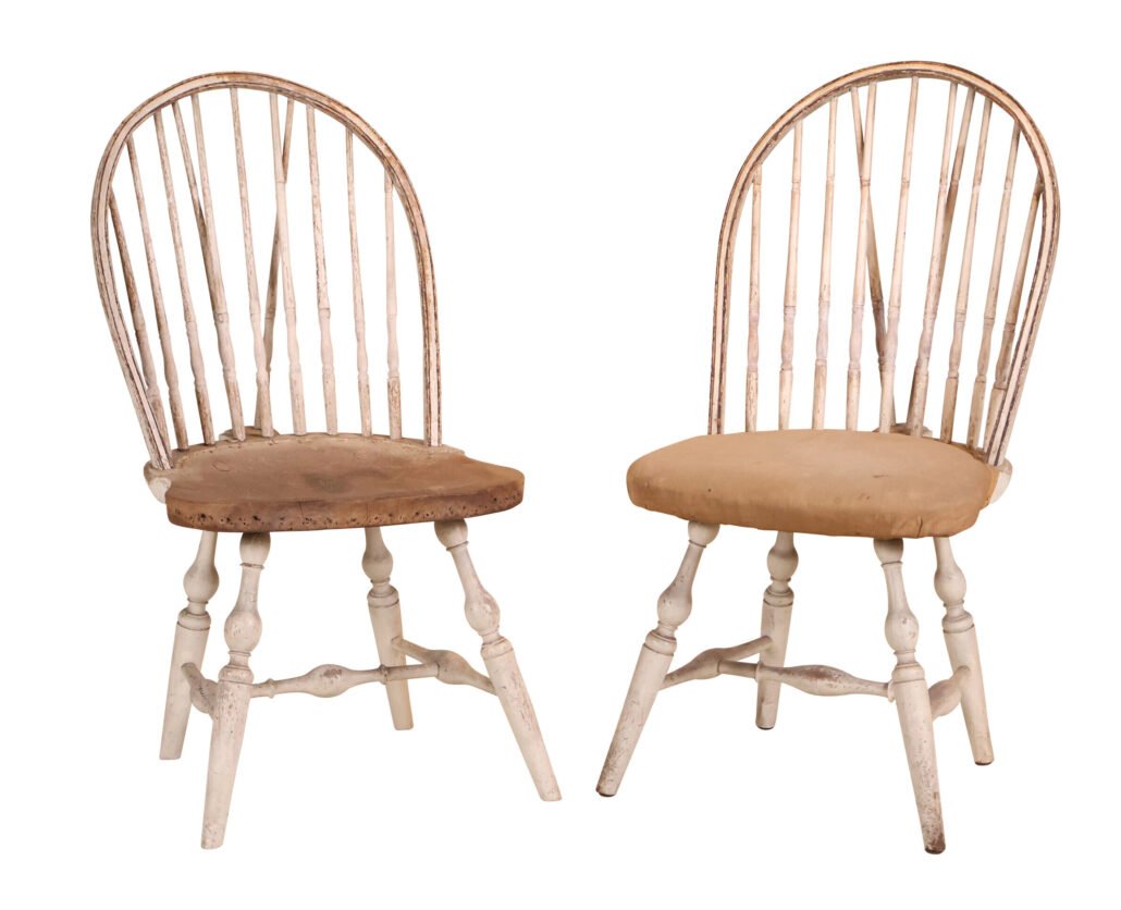 Windsor chairs: The John Brown pair of white painted bow-back brace-back upholstered Windsor side chairs,