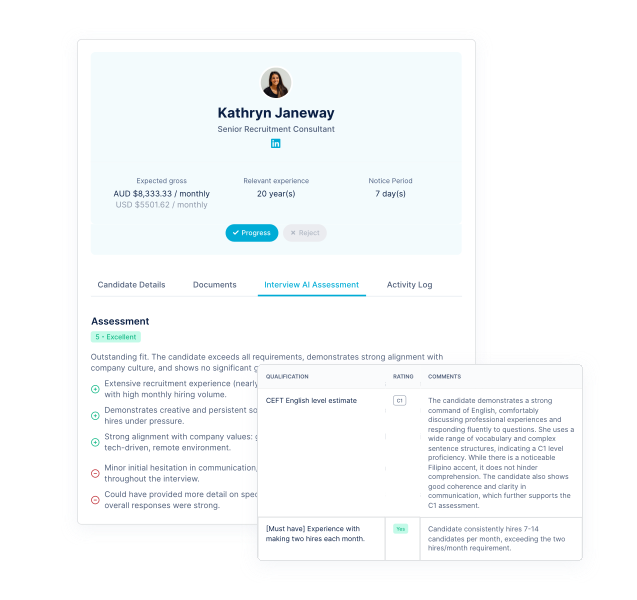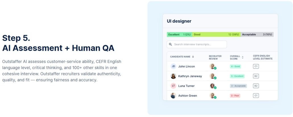 Every interview Anna conducts is recorded, transcribed, and scored across 100+ skill dimensions, including customer service skills, CEFR language level, and critical thinking. Outstaffer recruiters then review, validate, and deliver ranked shortlists — ensuring the speed of AI and the judgment of human expertise work together seamlessly.