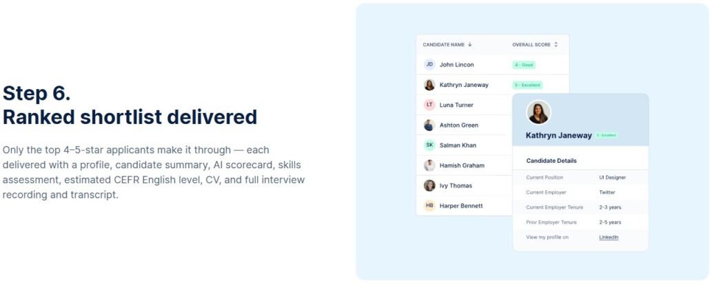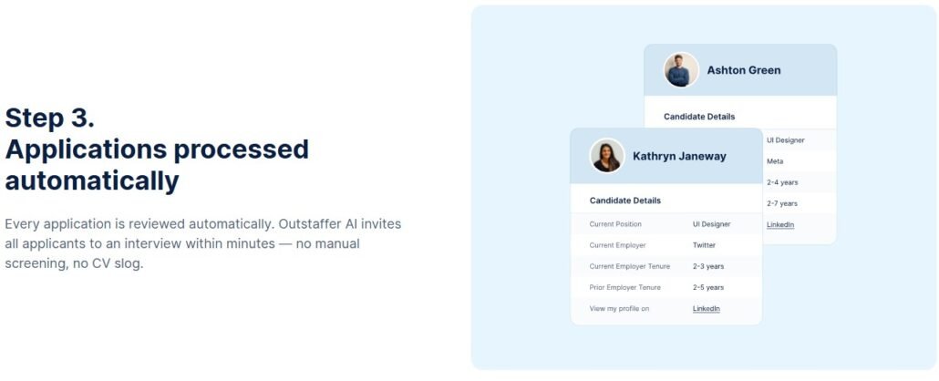 By combining AI-led interviews with recruiter validation, Outstaffer AI Recruiter automates up to 90% of the hiring process — from application intake and first-round interviews to ranking and shortlisting — without requiring any software setup or training. The result: verified shortlists in 4–7 days, 15–20+ hours saved per role, and a significantly better candidate experience.
