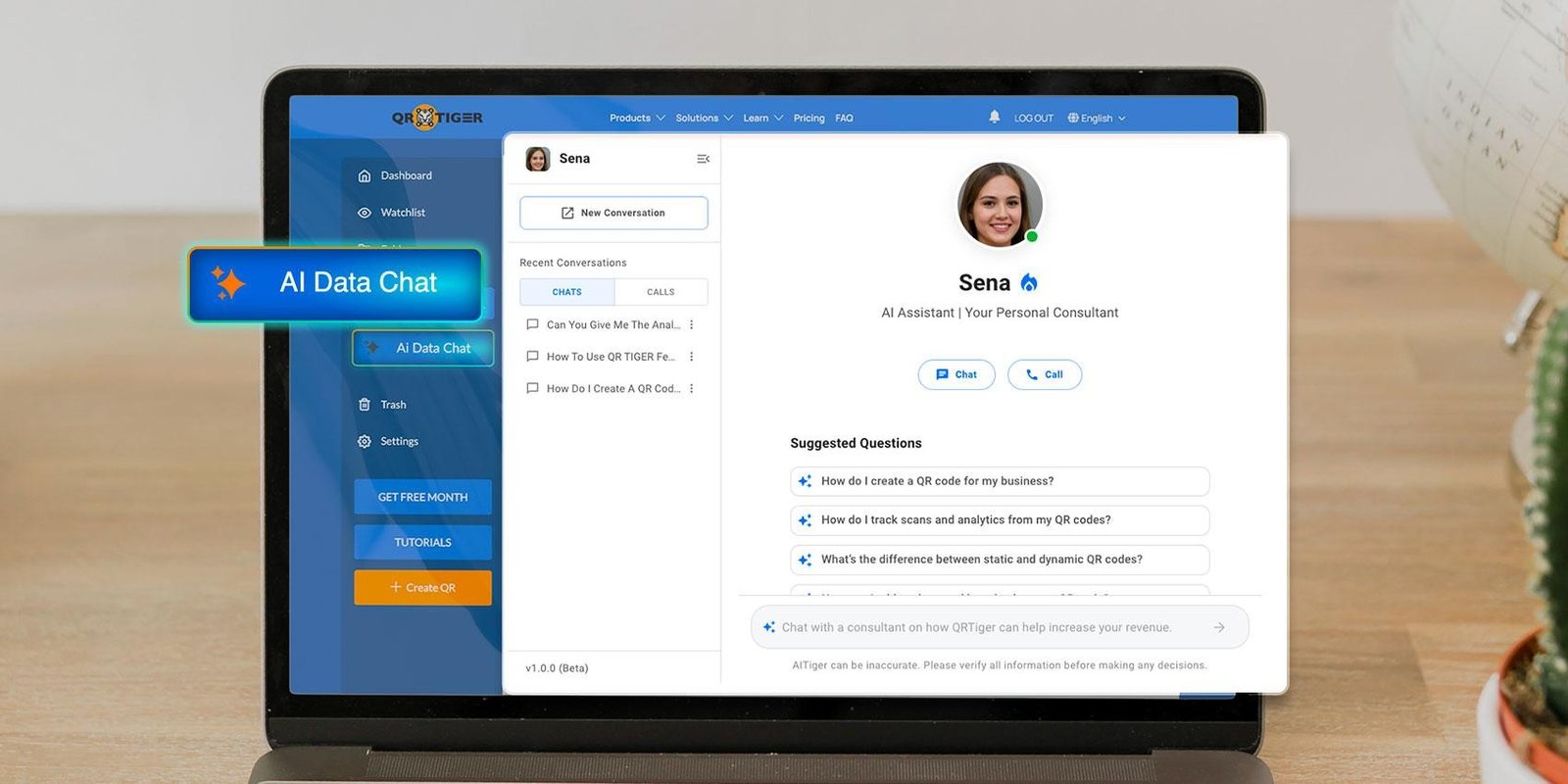 The AI Data Chat is accessible directly from the user dashboard, under the search bar, for quick access. Users can chat or call with Sena about QR code analytics in seconds, working entirely within their QR TIGER account without pulling data from the Internet or external sources.