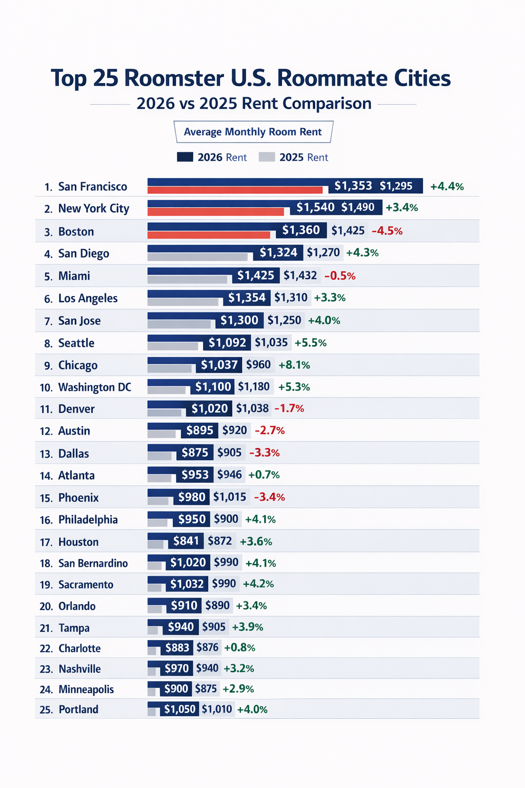 - Record highs in major metros: Multiple U.S. cities hit all-time roommate rent peaks in 2026, particularly on the West Coast.