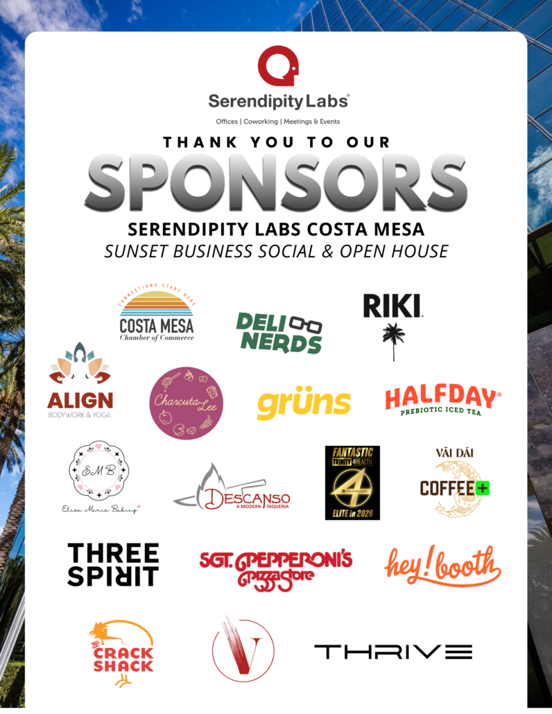 Located at Pacific Arts Plaza, Serendipity Labs Costa Mesa offers glass-front private offices, light-filled conference rooms fully equipped for meetings, expansive lounges, and sweeping views of the city and Noguchi Garden. The Sunset Business Social & Open House is designed to give guests an inside look at the space while connecting decision-makers and showcasing Serendipity Labs Costa Mesa as an ongoing resource for workspace, client meetings, and business events.