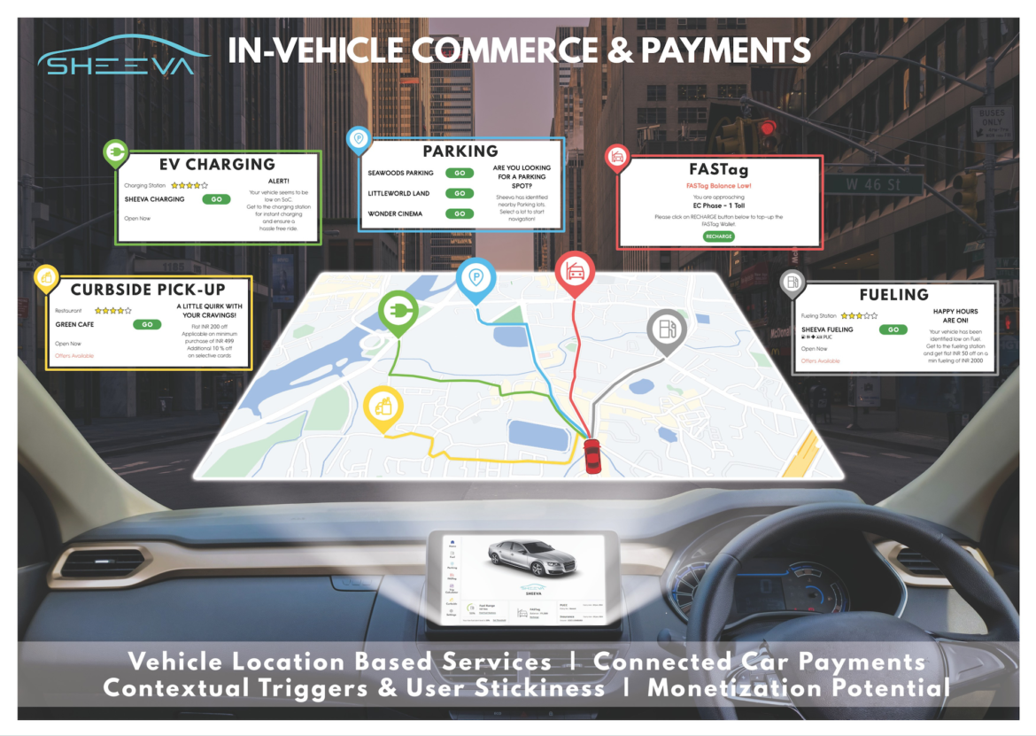 Sheeva.AI’s in-car payments and commerce solution introduces vehicle location-based services to monetize the driver experience. Using a patented precise geolocation technology, drivers seamlessly pay for and receive services such as fueling, EV charging, parking, curbside pickup and drive-through via their car’s IVI screen.