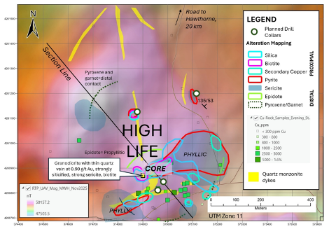 Recent fieldwork at the High Life target has identified strong alteration and gold mineralization consistent with a copper-gold porphyry system (see News Release dated March 31st, 2026), including silicification, sericite alteration, quartz veining, and localized copper mineralization. See Figure 1.These features are spatially associated with geophysical anomalies, including strong magnetic highs with coincident resistivity highs, supporting the interpretation of a robust porphyry system at depth.