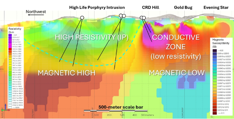Figure 2. Section through High Life and CRD Hill with view to East. High Life porphyry is strongly resistive with a coincident 1-kilometer-wide magnetic high anomaly. CRD Hill is very conductive with a coincident large magnetic low.