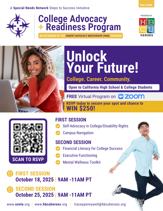 Special Needs Network (SNN), California’s leading disability rights organization, has partnered with national nonprofit HBCU Heroes to launch the Fall 2025 PAM College Advocacy & Readiness Program—a free, virtual workshop series aimed at empowering neurodivergent students and their parents with tools for college and career success.