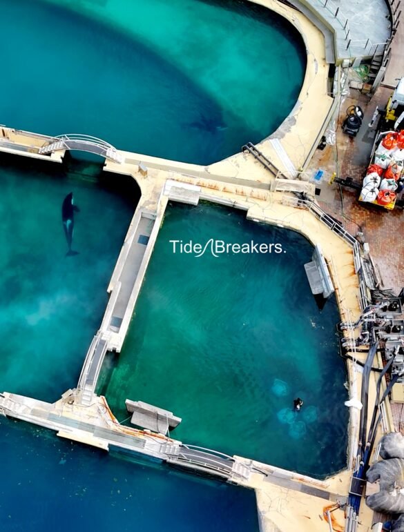 TORONTO, CANADA — TideBreakers releases new drone footage, filmed on February 24, 2026, revealing the tank holding captive orcas Wikie and her son Keijo at Marineland Antibes, France, visibly deteriorating with construction workers on site.