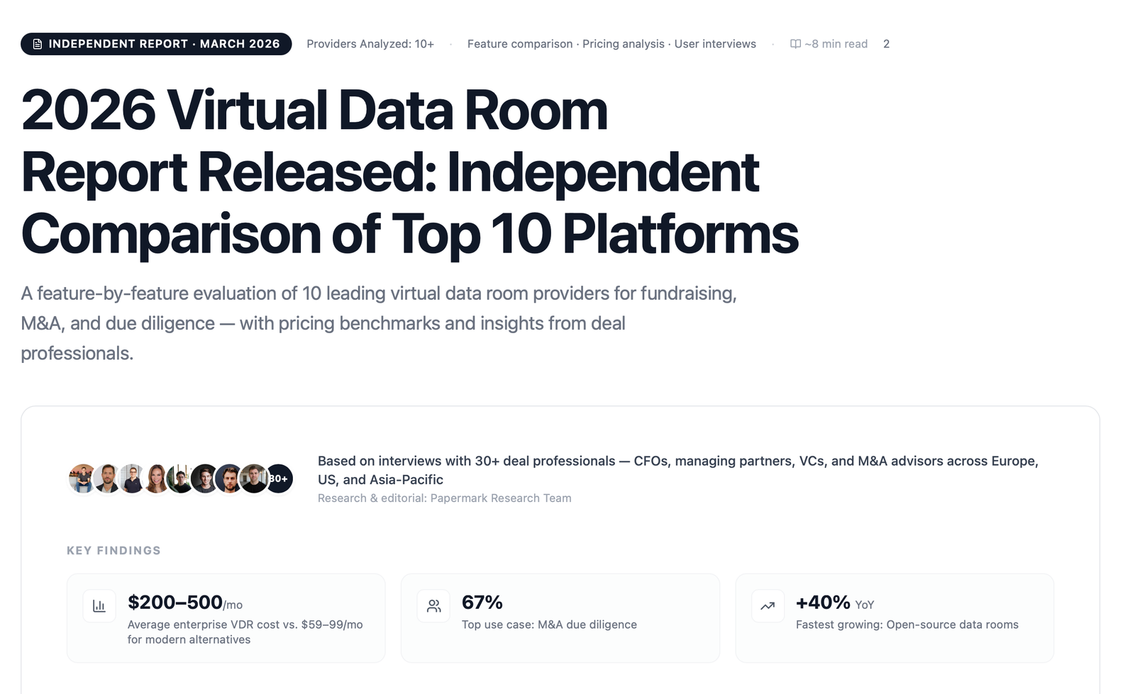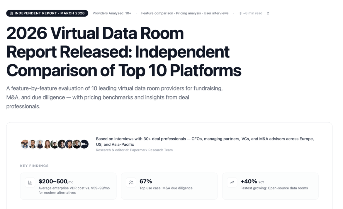 The full report, including detailed provider comparisons and pricing benchmarks, is available at papermark.com/virtual-data-room-providers.
