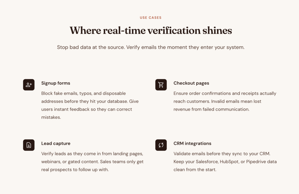 Frontend Framework Components: Developers building with React, Vue.js, Svelte, and Next.js can drop in ready-made hooks, composables, and components that perform real-time email validation on the client side. The Next.js integration supports Server Actions, Edge Middleware, and Zod schema validation out of the box.