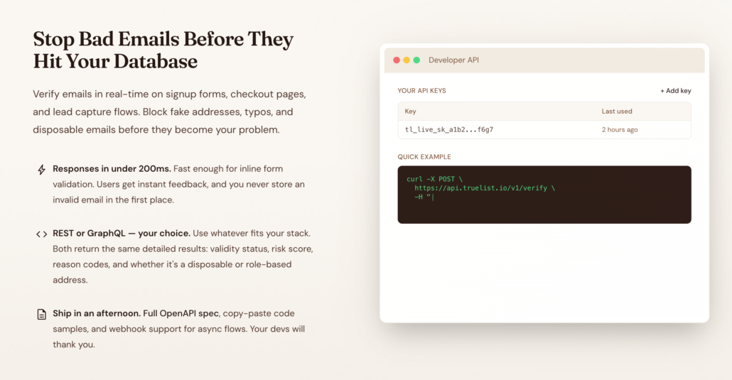 AI and Developer Tooling: A dedicated MCP (Model Context Protocol) server enables AI coding assistants — including Claude, Cursor, and VS Code extensions — to validate emails natively. Agent skills are also available to teach AI tools how to use the Truelist API in code generation contexts.