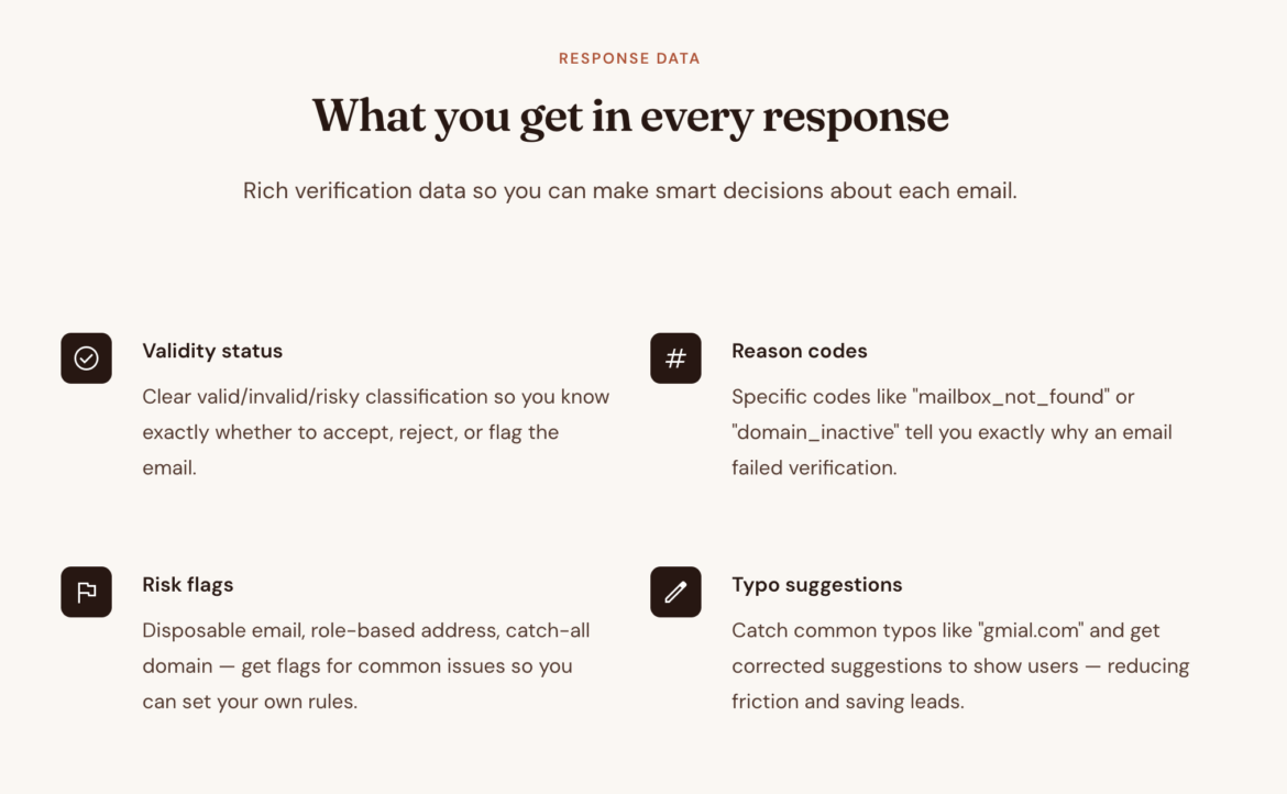 Frontend Framework Components: Developers building with React, Vue.js, Svelte, and Next.js can drop in ready-made hooks, composables, and components that perform real-time email validation on the client side. The Next.js integration supports Server Actions, Edge Middleware, and Zod schema validation out of the box.