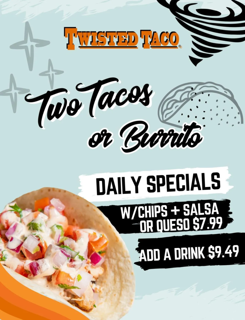 “We wanted to create something special for the community that supports us every day,” said Paul Gibbs, co-owner of Twisted Taco Express. “Our daily specials are a way for us to share our passion for great Tex-Mex and offer fantastic value at the same time. Whether it’s a quick lunch during the week or a family meal on the weekend, there’s now a new reason to stop by and enjoy the fresh, bold flavors we’re known for. We invite everyone in Marietta to come find their new favorite day at Twisted Taco Express.”