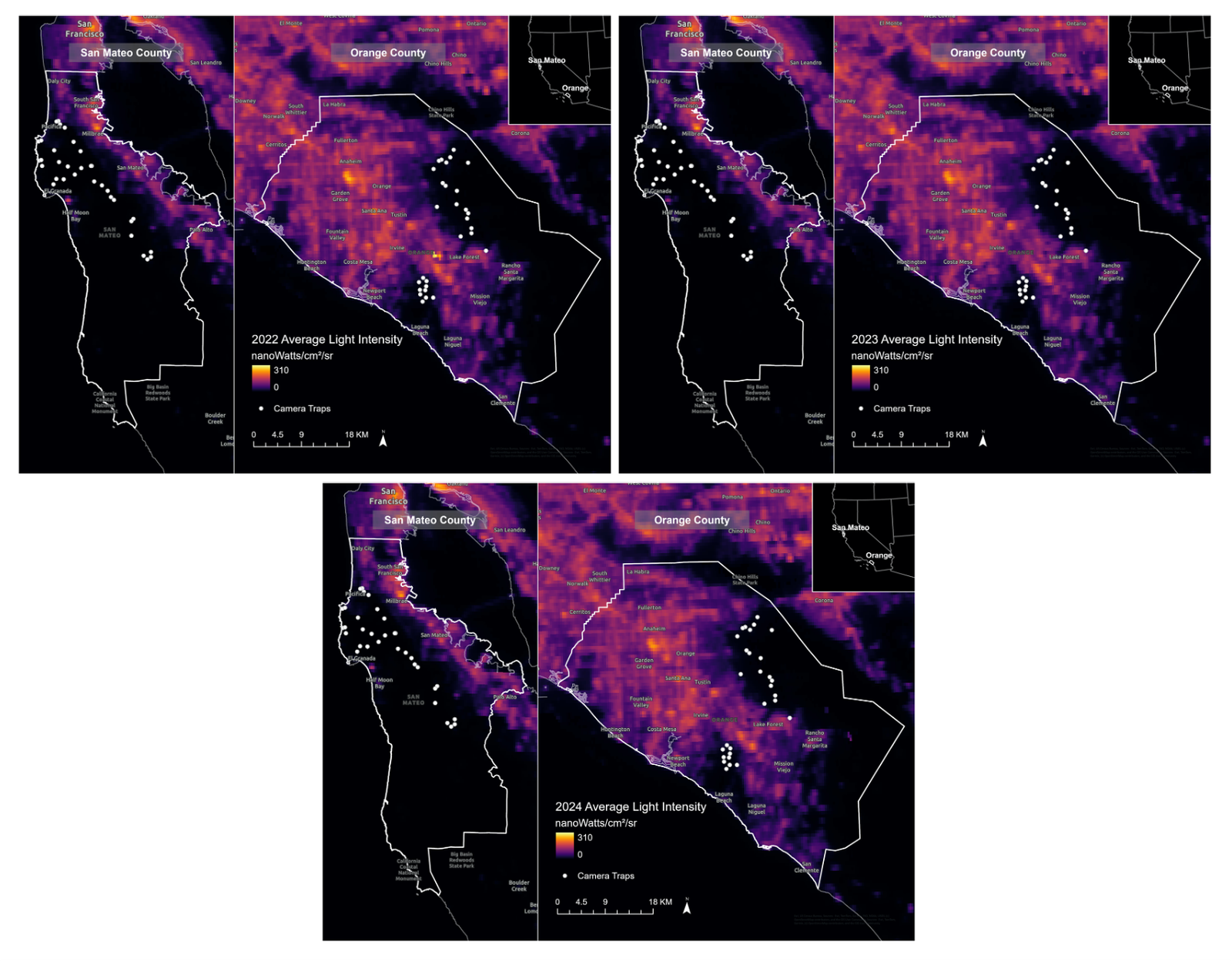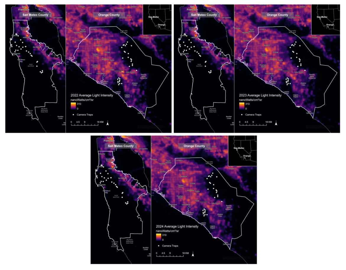 This new research explores how urbanization affects the behavior of an apex predator, the puma, a co-occurring mid-sized carnivore (the bobcat), and the primary prey for pumas, mule deer. Using data from 61 camera trap stations over three years, the researchers analyzed how artificial light pollution and human activity shape wildlife activity patterns in protected areas in Orange and San Mateo counties.