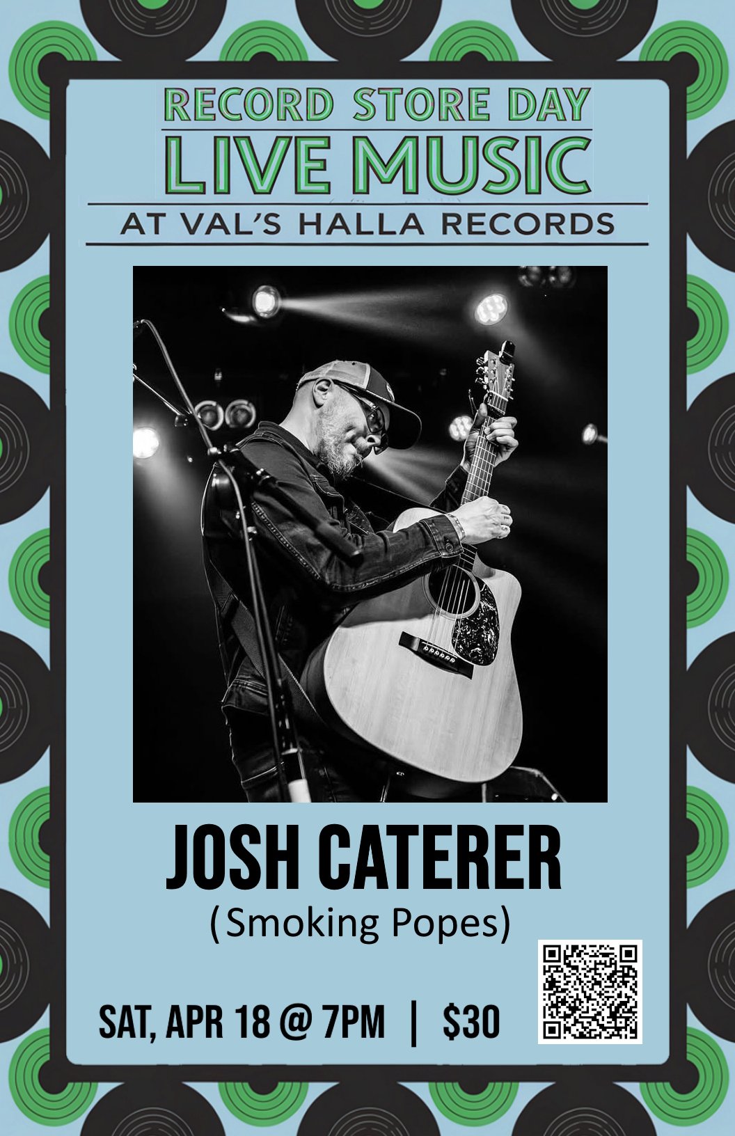 The day builds toward a featured performance from Josh Caterer of Smoking Popes, who will take the stage for a rare solo set. It is his only scheduled performance this spring and a one-off appearance tied to Val’s halla Records. After the store closes, the space will transition into a ticketed evening show, where Caterer will perform a single set in a live venue setting.