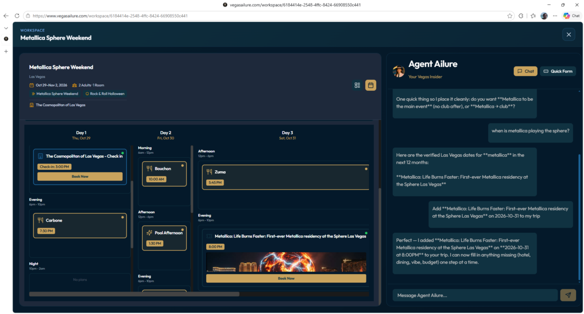 Positioned as the authoritative third-party expert Altman described, Agent Ailure is fully integrated into the ChatGPT ecosystem. Users can initiate their journey within ChatGPT, where Agent Ailure acts as the specialized intelligence layer that handles the complex, local nuances of the Las Vegas Strip—logistics that general-purpose models purposefully avoid. Then passes to VegasAilure’s workspace for reference and modifications.