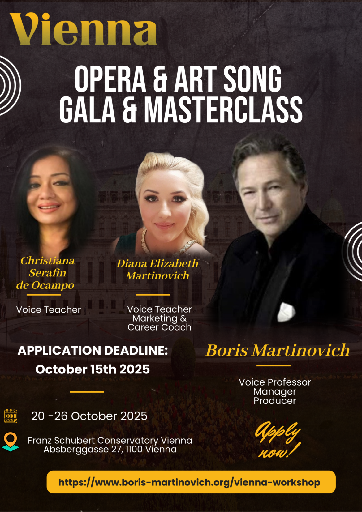 Career Development: Navigate the complexities of the professional music world, building your network and crafting a sustainable career path. According to Boris Martinovich, “This is invaluable. Many singers struggle with the business side. We aim to provide clarity and direction, empowering singers to take control of their careers.”